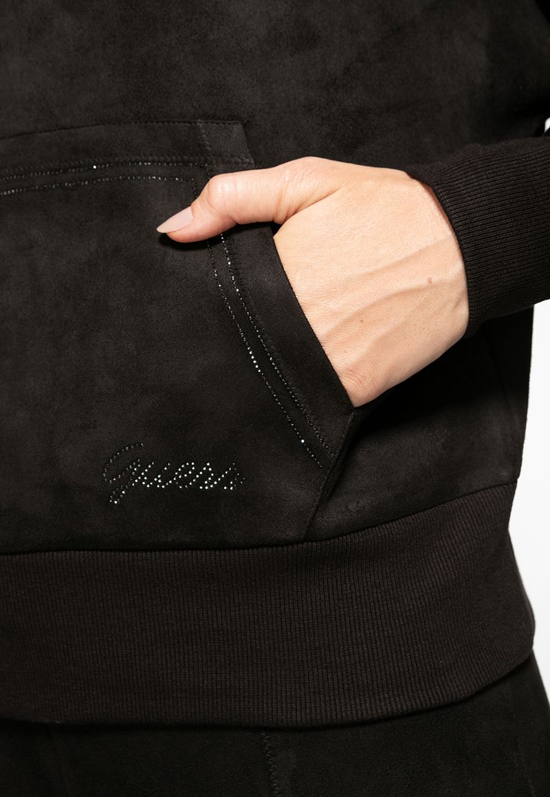 Blusa de moletom feminina em suede eco, com toque suave e caimento confortável. O capuz ajustável e o bolso canguru trazem praticidade, enquanto os detalhes em strass adicionam brilho discreto, criando um visual casual sofisticado.