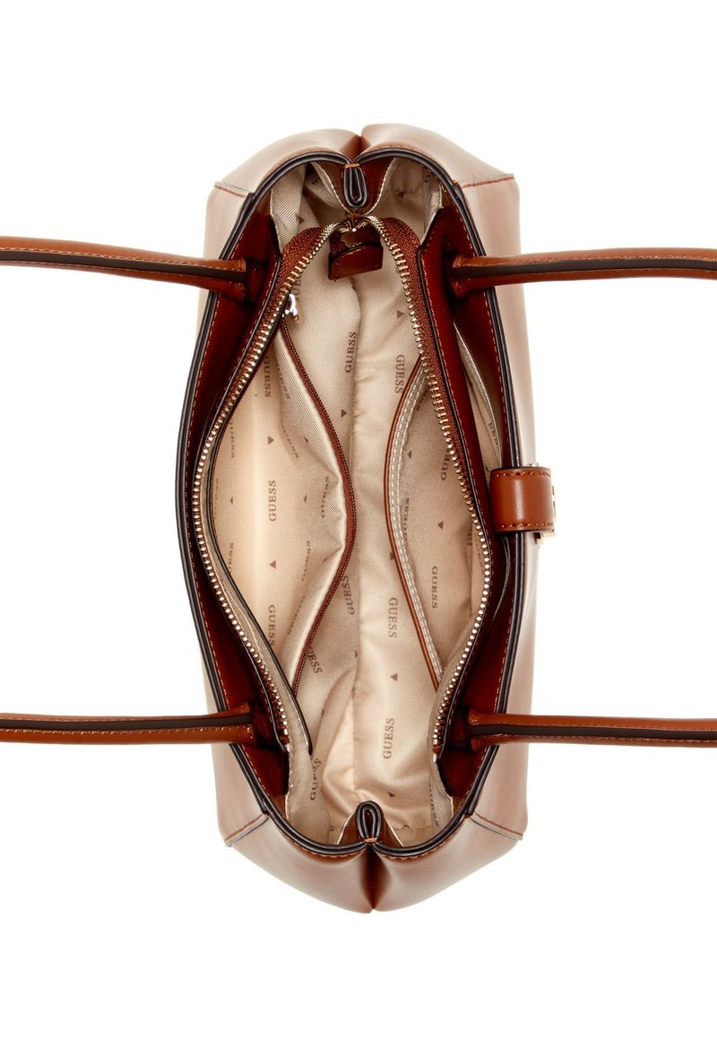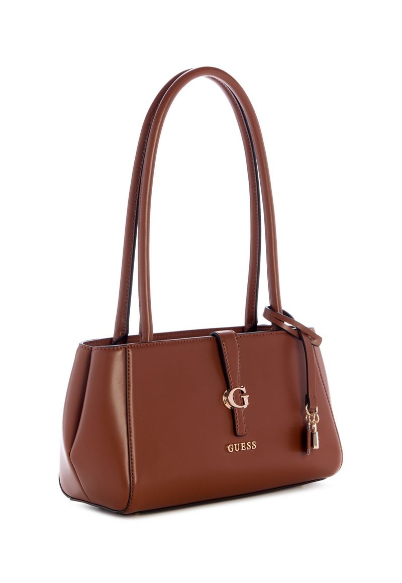 A bolsa Carrie Girlfriend Shoulder Satchel apresenta design sofisticado com ferragens douradas e o logo Guess em destaque na parte frontal, acompanhado de um elegante G decorativo. Produzida em material de poliuretano, conta com alças longas fixas, perfeitas para uso no ombro. Seu compartimento interno é forrado em tecido, oferecendo espaço funcional para organização. Ideal para quem busca uma bolsa estruturada com detalhes marcantes e estilo moderno.