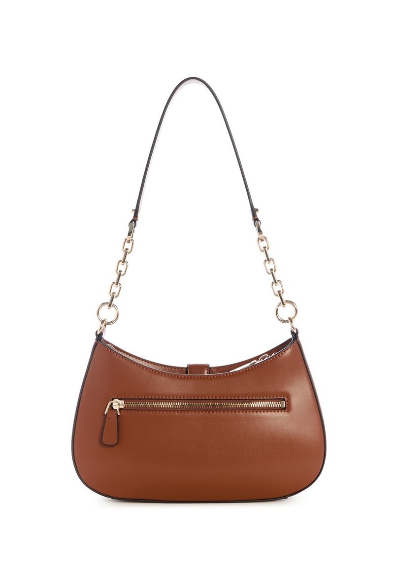 A bolsa Carrie Top Zip Shoulder Bag apresenta design sofisticado com ferragens douradas e o logo Guess em destaque na parte frontal, acompanhado de um elegante G decorativo. Produzida em material de poliuretano, conta com alças longas fixas, sendo metade em corrente dourada, que adiciona charme ao visual. Possui bolso externo traseiro com fechamento em zíper para maior praticidade. Seu compartimento interno é forrado em tecido, com espaço funcional para organização. Ideal para quem busca uma bolsa estruturada com detalhes marcantes e estilo moderno.