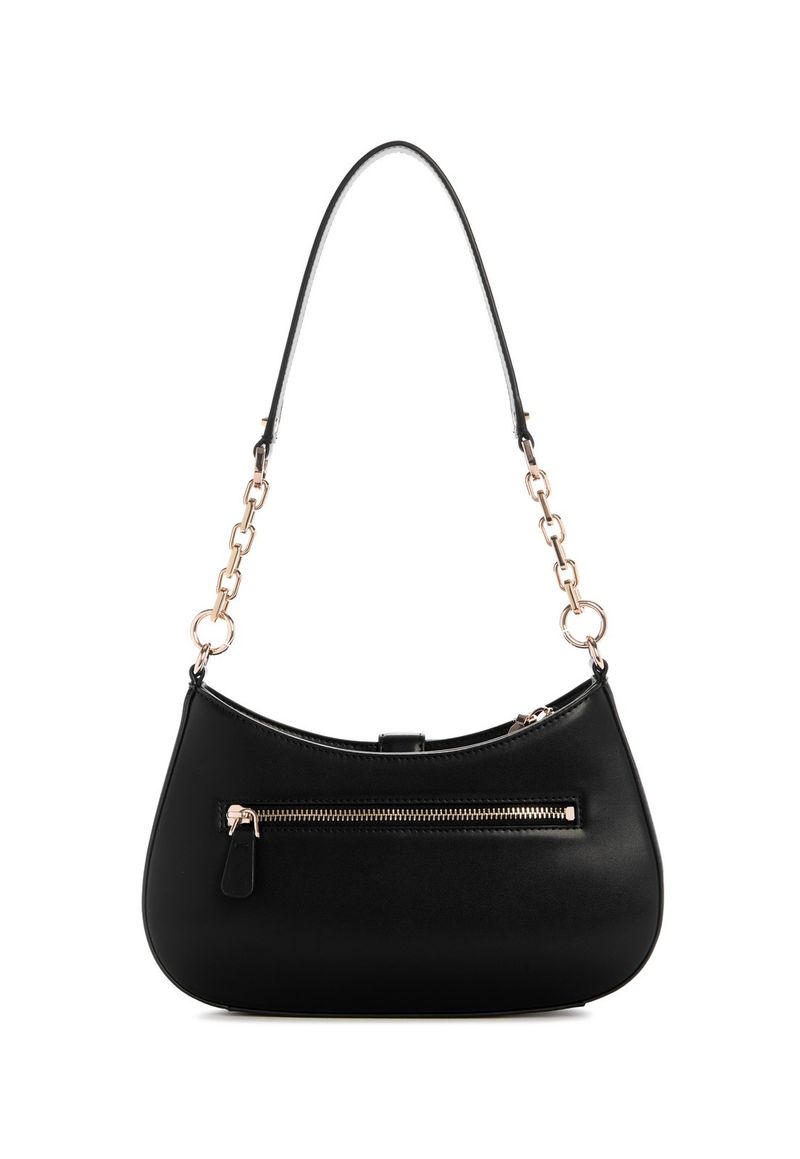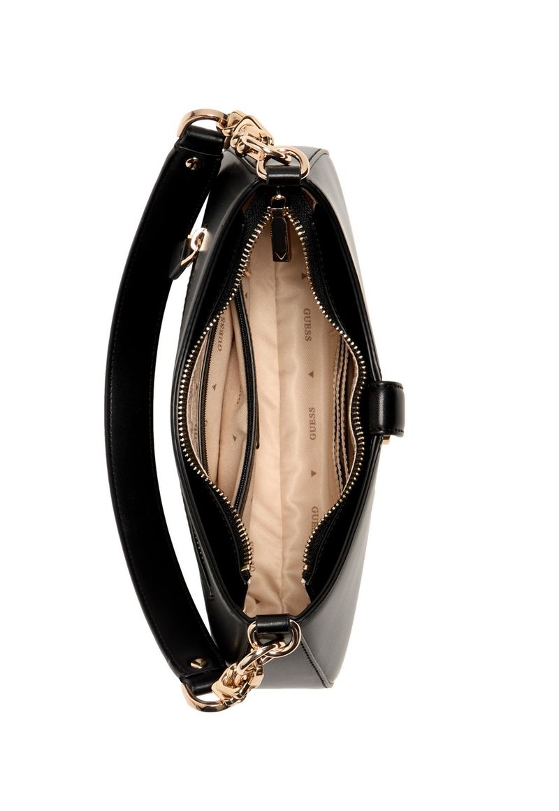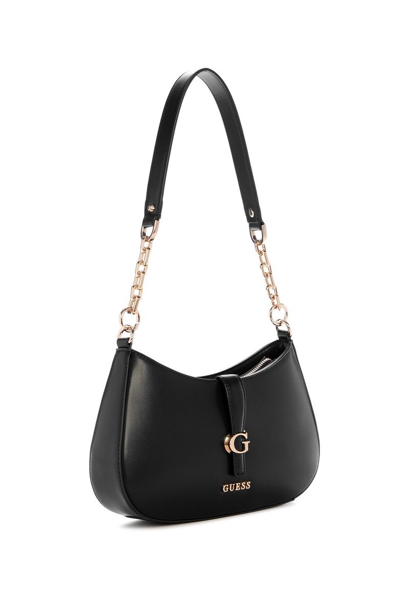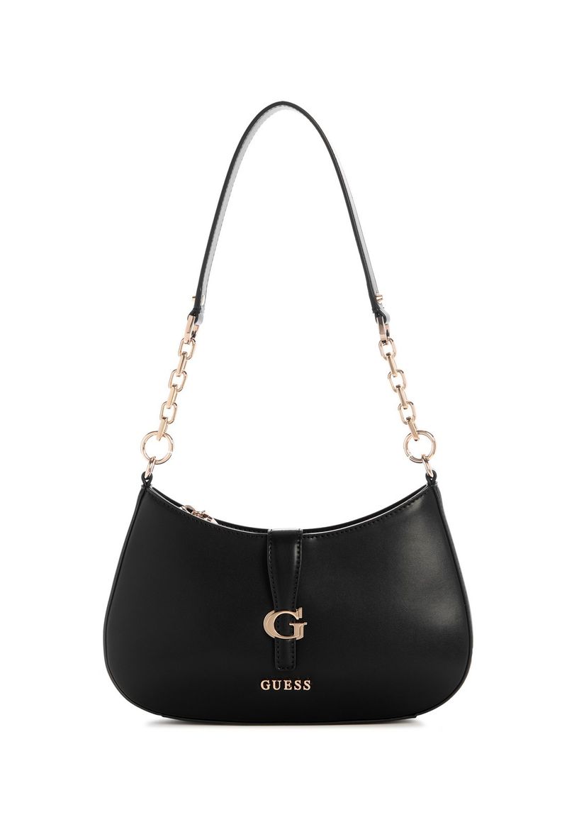 A bolsa Carrie Top Zip Shoulder Bag apresenta design sofisticado com ferragens douradas e o logo Guess em destaque na parte frontal, acompanhado de um elegante G decorativo. Produzida em material de poliuretano, conta com alças longas fixas, sendo metade em corrente dourada, que adiciona charme ao visual. Possui bolso externo traseiro com fechamento em zíper para maior praticidade. Seu compartimento interno é forrado em tecido, com espaço funcional para organização. Ideal para quem busca uma bolsa estruturada com detalhes marcantes e estilo moderno.