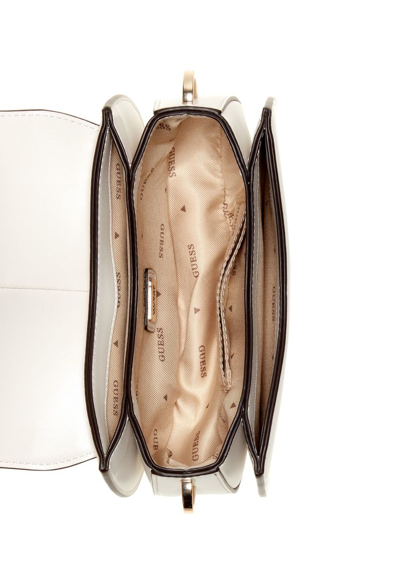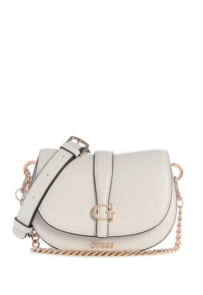 A bolsa Carrie Flap Crossbody apresenta design moderno com ferragens douradas e o logo Guess em destaque na parte frontal, acompanhado de um elegante G decorativo. Produzida em material de poliuretano, conta com duas alças: uma de ombro feita em corrente dourada e outra transversal ajustável com fivela, garantindo versatilidade no uso. Seu fechamento em flap com ímã adiciona praticidade e estilo ao visual. O compartimento interno forrado em tecido possui dois espaços organizadores, ideal para manter seus itens bem distribuídos. Perfeita para quem busca uma bolsa pequena com detalhes sofisticados e design funcional.