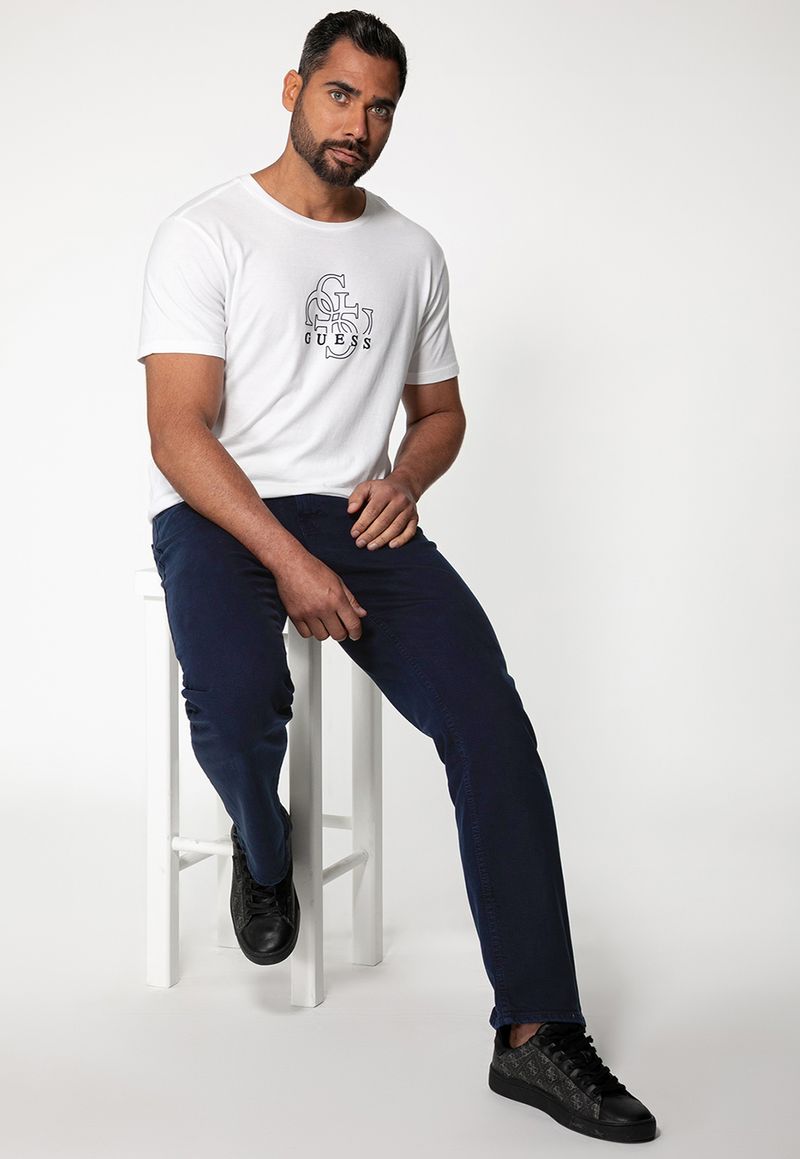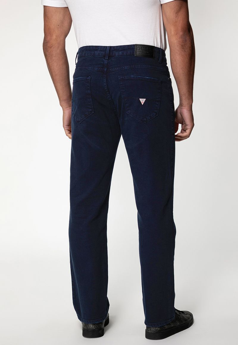 Calça masculina em sarja com modelagem regular straight, oferecendo conforto e estrutura para o dia a dia. A lavagem azul escuro traz versatilidade ao visual, enquanto os 5 bolsos, passantes e o logo costurado no bolso traseiro garantem um acabamento clássico.