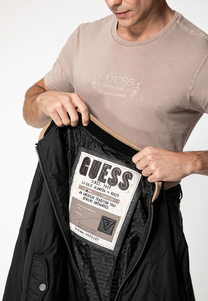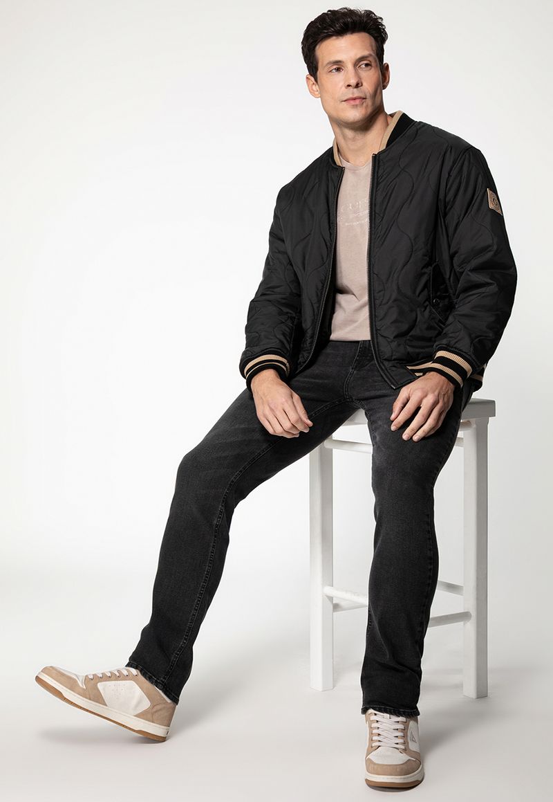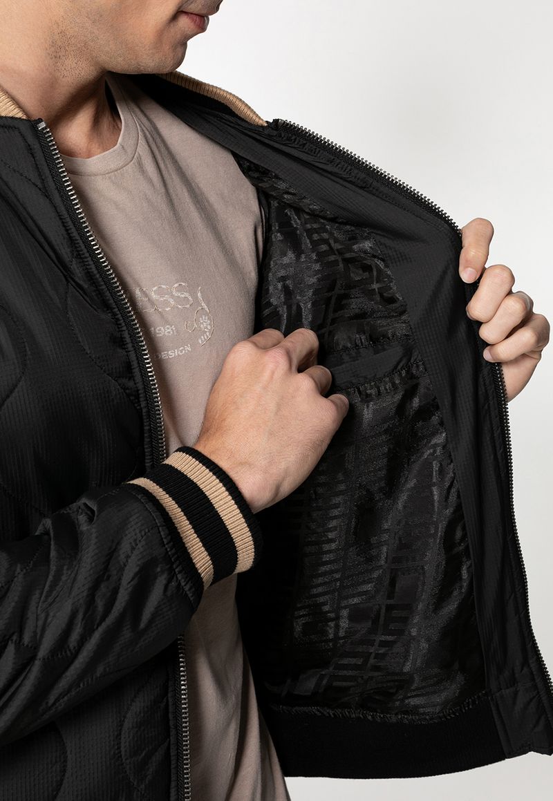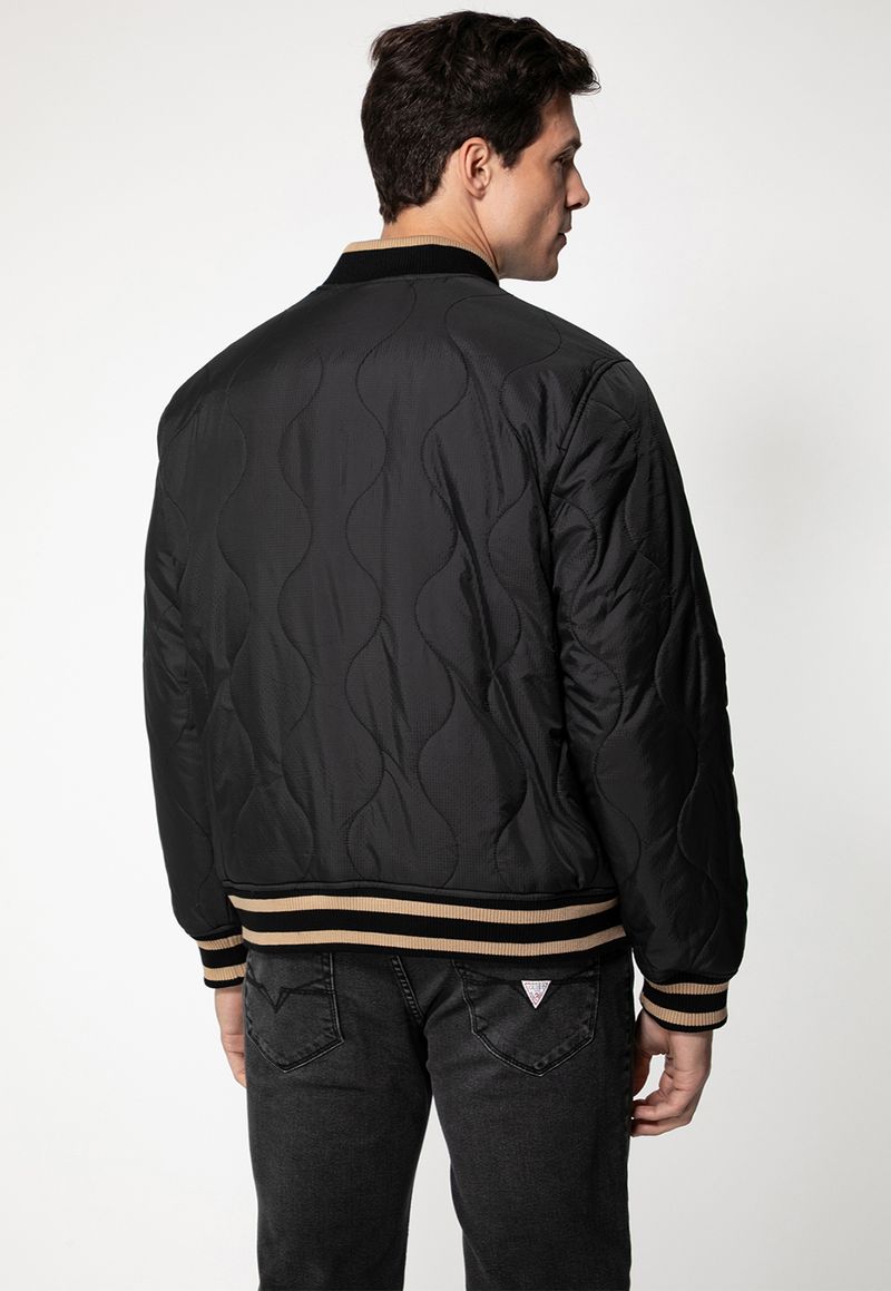 Jaqueta bomber preta em nylon com padronagem matelassada que adiciona textura ao visual. O acabamento esportivo aparece nos punhos e na barra listrada, enquanto o forro interno traz conforto. Uma peça moderna e versátil para compor looks urbanos.