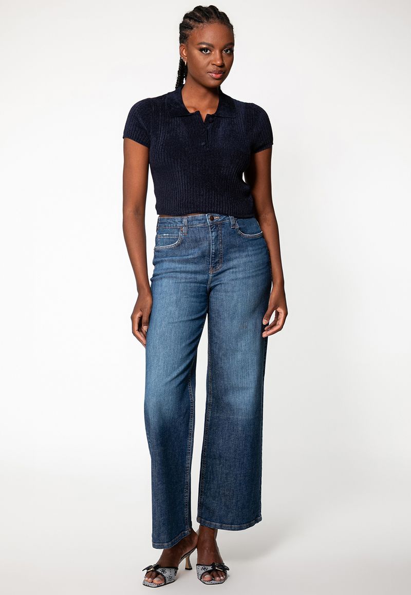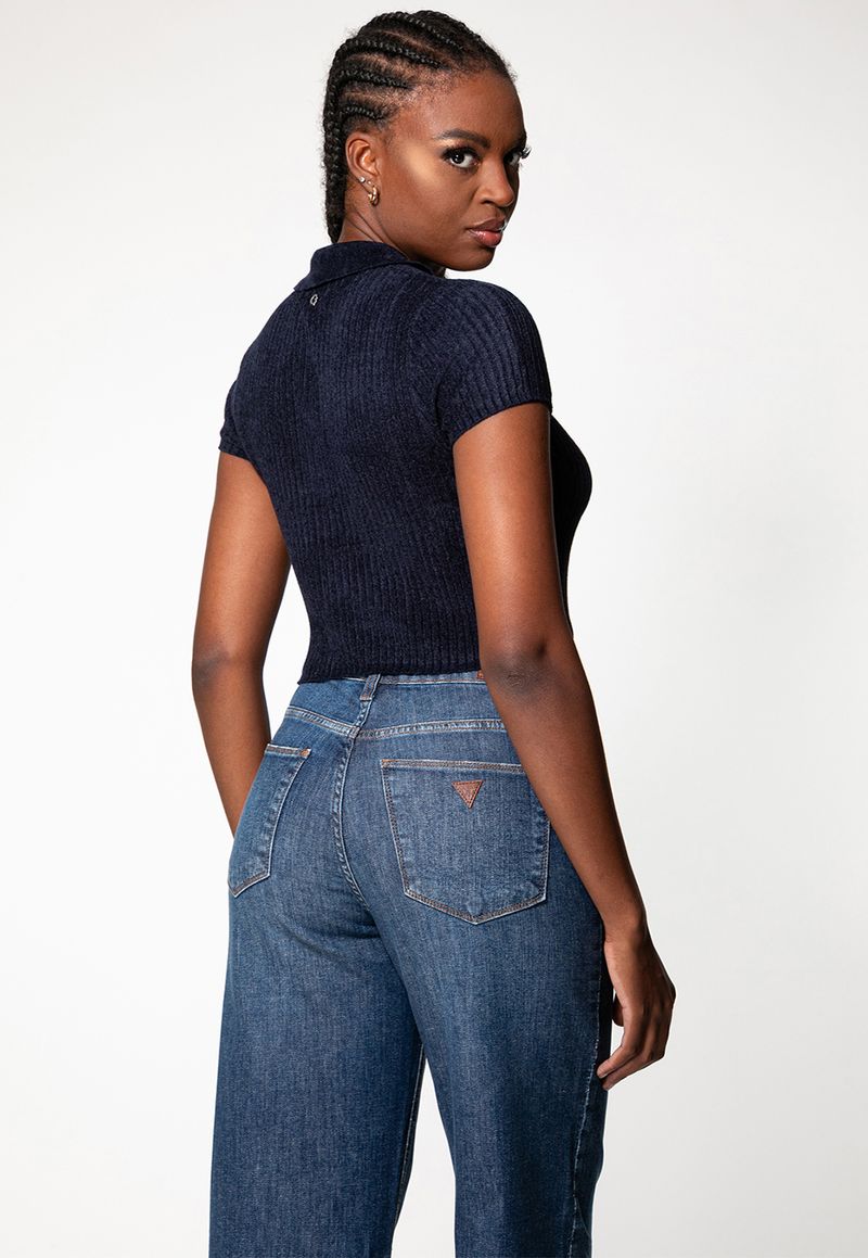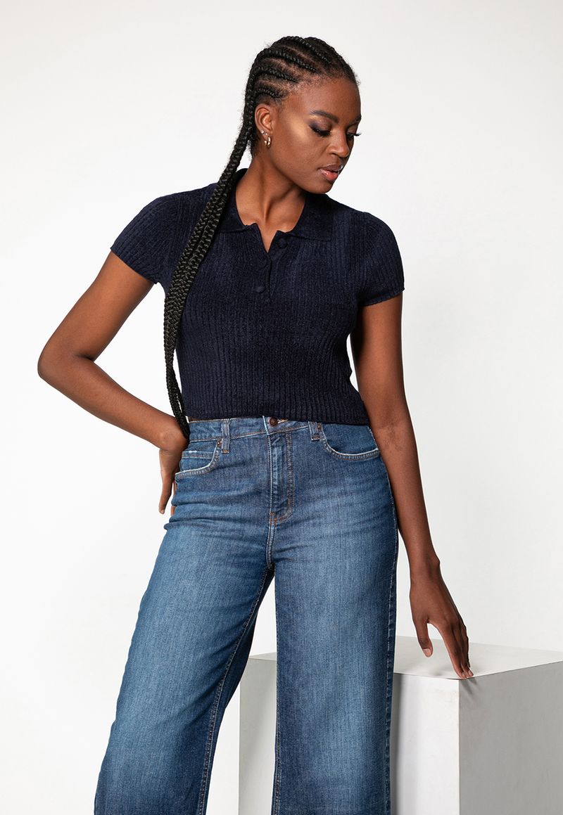 FemininoRoupasBlusasBlusas CroppedBlusas Manga CurtaCropped Polo Tricot Chenille Azul Marinho