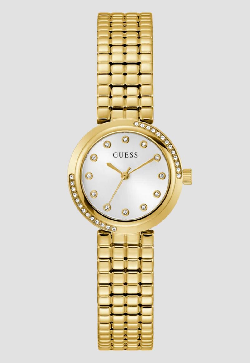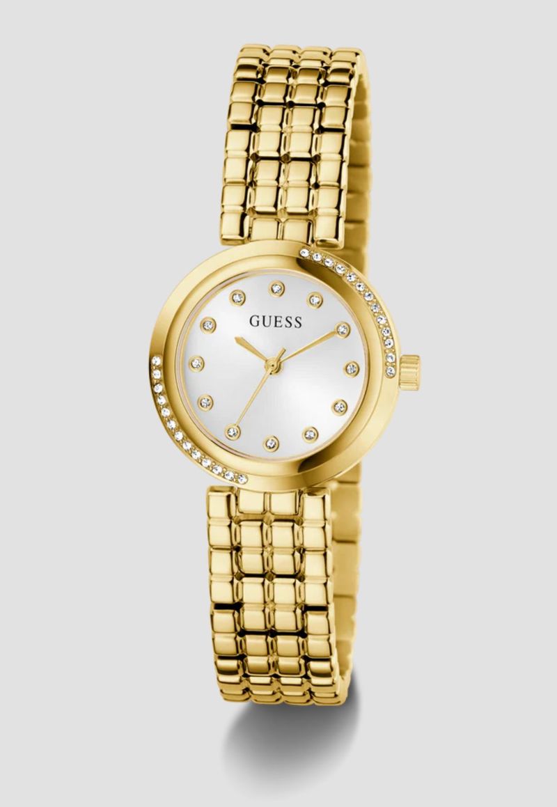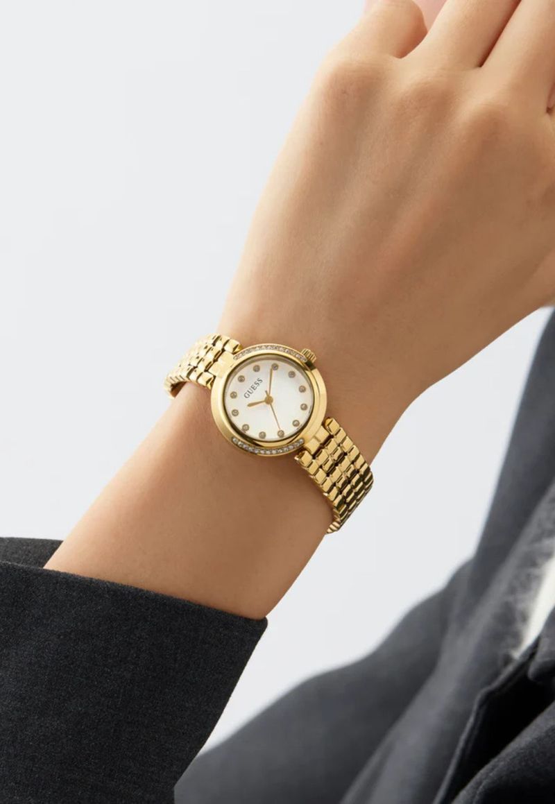 Exale elegância elevada com este relógio lindamente trabalhado! Esta bela caixa dourada de 28 mm exibe cristais assimétricos em seu bisel e é combinada com uma exclusiva e bela pulseira de aço reciclado polido com textura de contas. Um mostrador branco impecável com efeito raio de sol completa o visual!