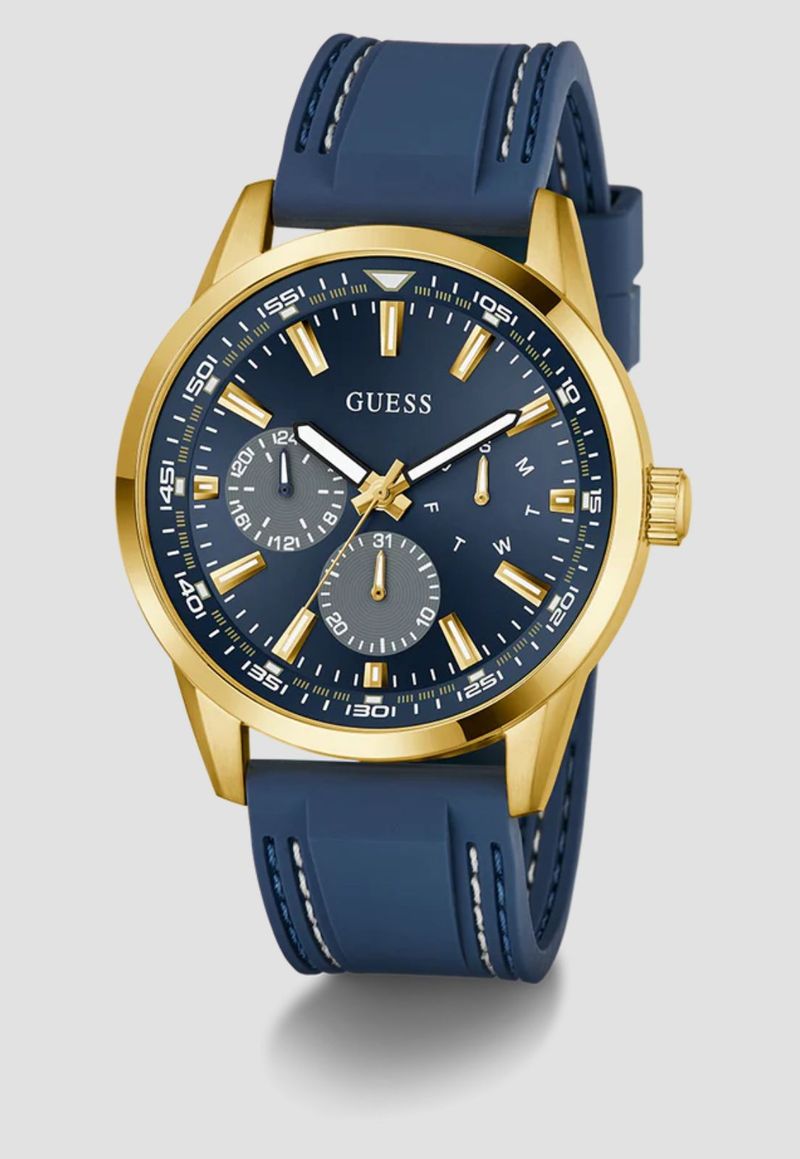 Este relógio esportivo dinâmico combina cores vibrantes com sofisticação, apresentando uma caixa redonda de 44 mm em aço reciclado escovado e polido em tom dourado, combinada com uma pulseira de silicone índigo com costuras chamativas. O mostrador sunray índigo apresenta recursos multifuncionais e adiciona profundidade e dimensão a este design de inspiração atlética. Oferecendo resistência à água de 50 metros, este relógio marcante é perfeito para o homem que busca uma sofisticação esportiva que acompanhe seu ritmo.