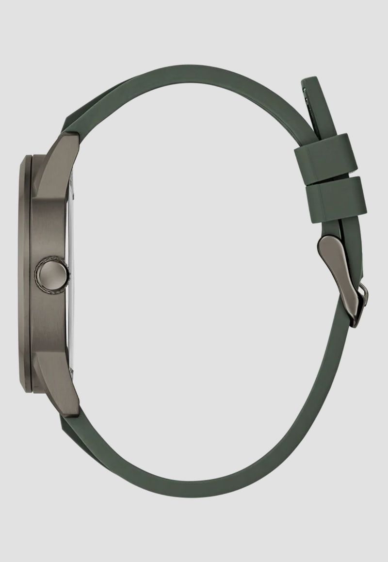 Este relógio esportivo dinâmico combina cores vibrantes com sofisticação, apresentando uma caixa redonda de 44 mm em aço reciclado bronze escovado e polido, combinada com uma pulseira de silicone verde-alga marinha com costuras chamativas. O mostrador preto com efeito raio de sol exibe recursos multifuncionais e adiciona profundidade e dimensão a este design de inspiração esportiva. Oferecendo resistência à água de 50 metros, este relógio marcante é perfeito para o homem que busca uma sofisticação esportiva que acompanhe seu ritmo.