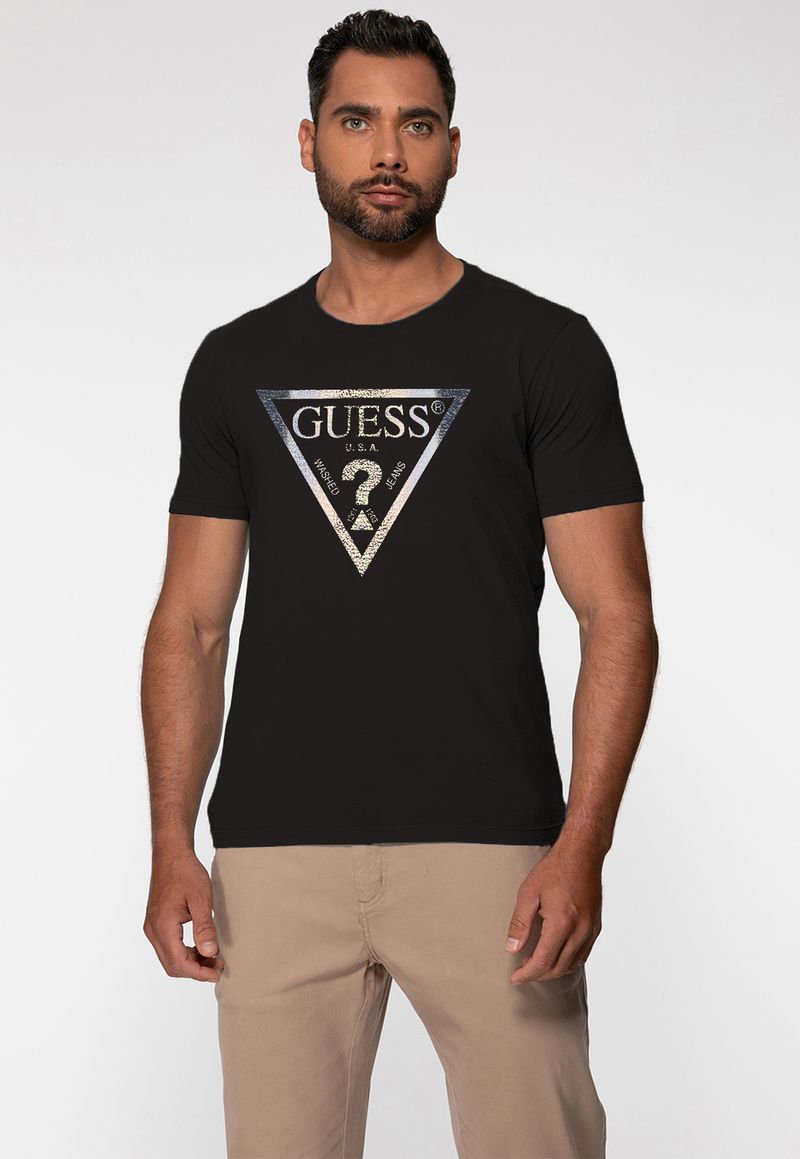 A clássica T-shirt Guess ganha um toque especial com o logo triangular estampado em efeito metalizado, trazendo sofisticação e modernidade ao visual. Ideal para homens que valorizam peças com identidade e estilo marcante.