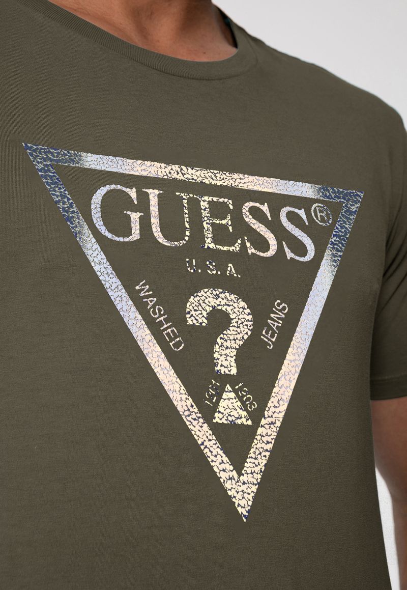 A clássica T-shirt Guess ganha um toque especial com o logo triangular estampado em efeito metalizado, trazendo sofisticação e modernidade ao visual. Ideal para homens que valorizam peças com identidade e estilo marcante.