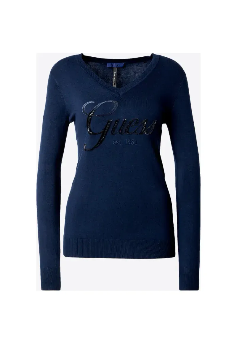 FemininoRoupasBlusasTricots e SuéteresSuéterBlusas Manga LongaSuéter de Tricot Guess Dec V Bordado E Hot Fix Azul Marinho