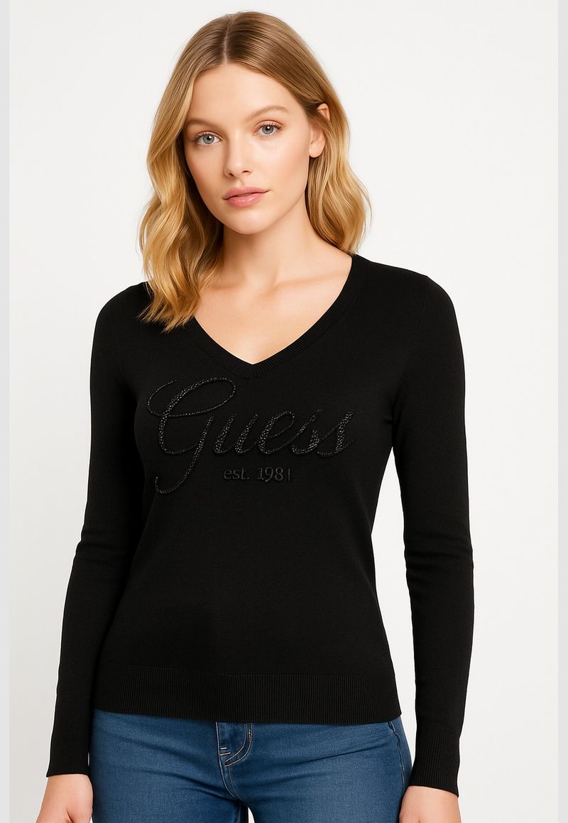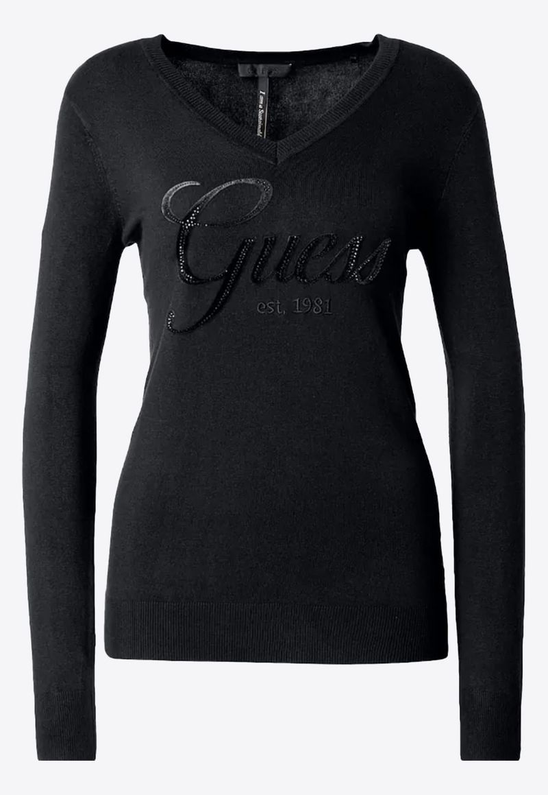 FemininoRoupasBlusasTricots e SuéteresSuéterBlusas Manga LongaSuéter de Tricot Guess Dec V Bordado E Hot Fix Preto